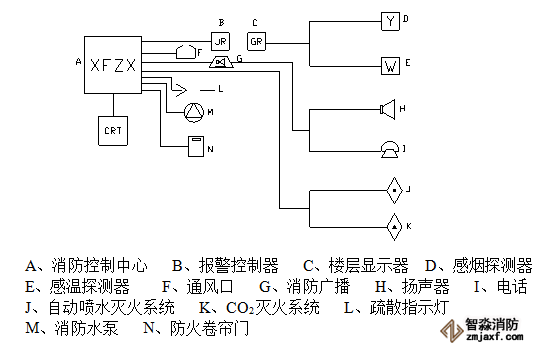 由各類探測器來監測環境的火災情況,一旦有火災發生,由探測器將信息傳送給報警控制器并報警,然后由報警器將信息傳送給CRT,并對信息進行確認,發出報警信號,將信息傳送給控制中心??刂浦行脑俅未_認后,切斷(一般使用)電源,打開應急照明和疏散指示燈,打開排煙風機,向控制區域內廣播火災信息,引導人員疏散,并將信息傳送到有關部門,啟動消防泵,啟動防火卷簾和防火門,關閉防火閥,將火災區域予以分隔,啟動滅火系統,對火災區域實施滅火。