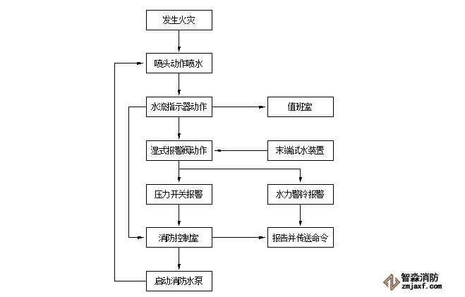 2、 當發生火災時,灑水噴頭的感溫元件會自動脫落,并開始向保護區灑水,由于系統內的水由原來的相對靜止狀態,變為流動狀態,水流指示器感應并送出信號。接著濕式報警閥開啟閥片,壓力開關感應送出信號,水力警鈴跟著報警,根據水流指示器和壓力開關的信號,控制器啟動消防水泵,向管網回壓供水,達到持續自動噴水滅火的作用。工作原理圖如圖: