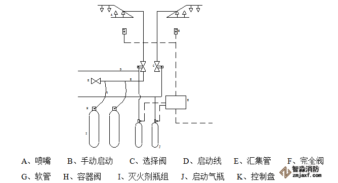 本系統的主要設備和器材包括:啟動氣瓶、啟動氣瓶、滅火劑瓶組、控制器、選擇閥、安全閥、容器閥、噴嘴等。