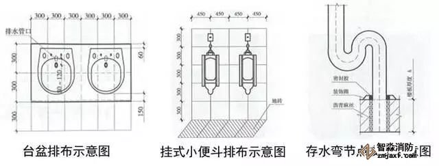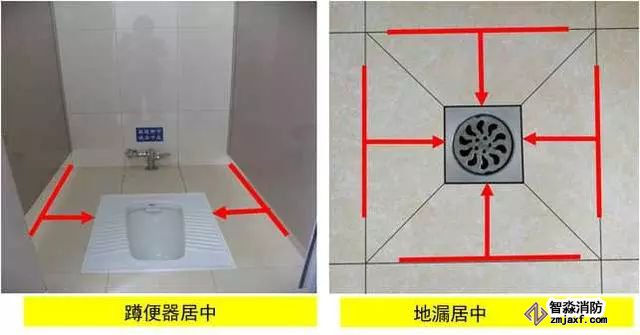 1、衛生器具安裝:根據衛生器具規格、間距及排水管位置進行排布,使器具與排水管、配件與墻面磚騎縫或居中。水嘴出水口宜于臺盆落水口上下對正。排水管應垂直,成排存水彎應朝向一致,存水彎與排水管間隙用瀝青麻絲填塞密實后加不銹鋼裝飾圈,地漏應避開人上廁所時常站的地方,且距板塊中間對稱設置。