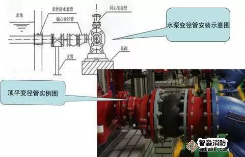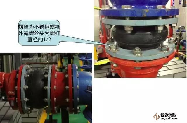 3、水泵吸水、出水變徑管安裝質量控制要點:水泵吸水口安裝上平偏心大小頭,出水口安裝同心大小頭,螺栓外露長度不大于螺桿直徑的1/2,且長度一致。