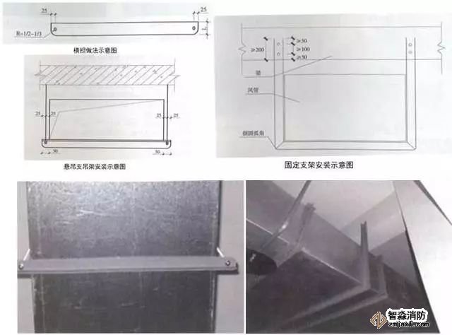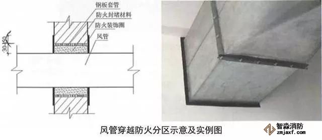 2、風管穿越防火分區做法:用2mm厚鋼板加工制作風管套管,套管接縫應滿焊,套管尺寸比風管四周尺寸大30~50mm,套管長度與墻面厚度一致。安裝完后用防火材料將套管與風管間隙填塞密實。用2mm厚、30~50mm寬黑色橡膠裝飾圈收口,裝飾圈角部45°拼接。風管穿越防火分區處必須設防火閥,防火閥距墻分隔墻間距不大于200mm,風管長邊大于630mm時,宜在防火閥兩側設單支吊架。