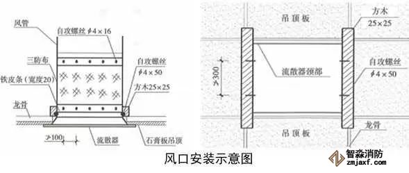 根據策劃后的圖紙,確定風口位置,在風口頸部用手槍鉆打眼,孔徑4mm,打眼間距不大于100mm,用自攻絲和1.5~2.0mm厚的金屬條將三防布固定到風口頸部。方木防火防腐處理后固定在吊頂龍骨上,用自攻絲將風口固定在方木上,自攻絲間距不大于300mm,校正風口,與吊頂結合嚴密。
