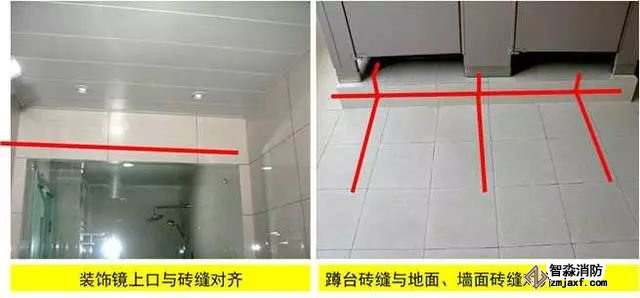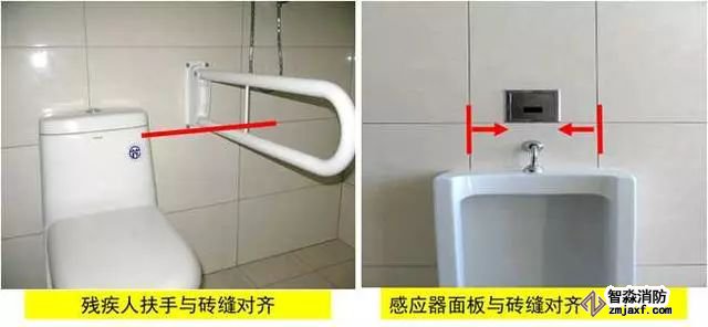 質量控制要點:器具、排水管、配件等與墻、地面磚居中、對縫,周邊打膠光滑密實。成排器具安裝應排列整齊,高度一致,間距均勻。