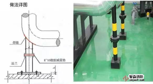 根據管道公稱直徑大小,選擇不同厚度的鋼板,加工成肋板,校正管道的垂直度,先將肋板底端焊接固定到管道周圍的支架上,再將肋板側面與管道焊接,檢查焊縫,再次校正管道垂直度,無誤后,刷防銹漆、面漆,設計要求保溫的進行管道保溫。