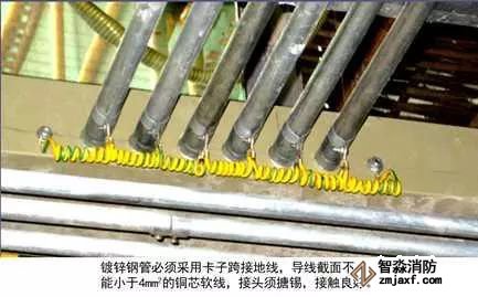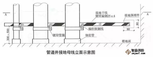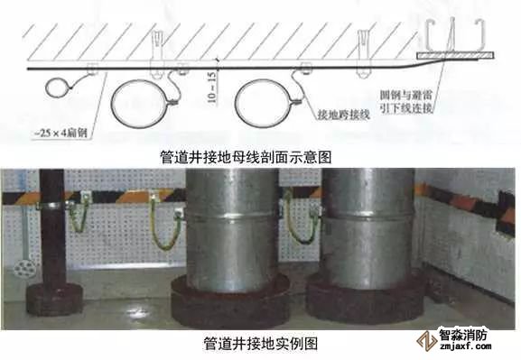 7、高層建筑管道頂部和底部接地:有接地預埋鋼板或垂直接地母線上引接接地母線,接地母線距地300~500mm,距墻10~15mm,并間隔100mm刷45°斜向黃綠相間油漆。將于管徑相匹配的接地抱箍安裝于管道上,抱箍必須與金屬體緊密接觸,編織軟銅線一端與抱箍連接,另一端與接地母線連接,螺栓連接處應加平墊片和彈簧墊片。DN≥100mm時,采用10mm²編織軟銅線,DN≤80mm時,采用4mm²編織軟銅線。