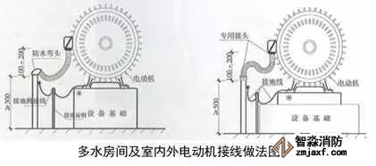 1、電源配管連接:根據電動機接線盒位置敷設電源管,成排電動機接線盒宜同向排列。電源敷設在靠近接線盒的方向,管口離地高度宜≥300mm,低于電動機接線盒中心100~200mm,室外電源管高度與接線盒中心一致,管口安裝防水彎頭。在距管口50~100mm處焊接接地螺栓。軟管管徑應與電源管同徑,軟管應留有適當余量,兩端采用專用管接頭盒專用盒接頭連接。導線壓倒接線盒內的接線端子上。電動機底座、電源管應與接地母線可靠連接。