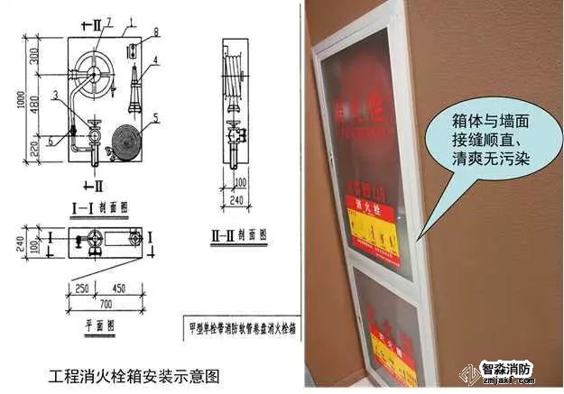 從箱門開啟側將管道接入消火栓內,栓口朝外,閥門中心距墻側面140mm(帶自救卷盤時距箱側面250mm),距箱里側表面100mm。螺紋連接時應有2~3扣的外露絲扣,清理干凈絲扣處的麻絲,并做防腐處理。消防控制按鈕安裝在箱門開啟處、箱內側的最上部,并注意電氣專業的配合。除箱門安裝玻璃者以及能被擊碎的透明材料外,均應設置箱門緊急開啟的手動機構,與墻面交接清爽無污染。