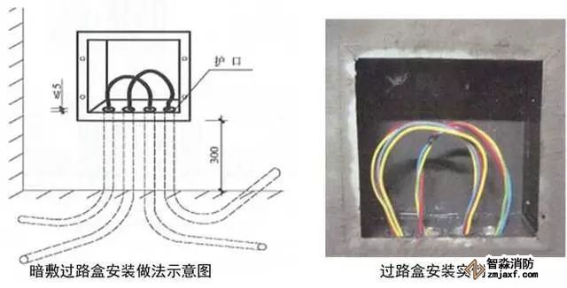 1、過路接線盒:在導管敷設時,按照規范要求在適當位置設置過路接線盒。過路盒安裝時距地高度宜為300mm;在結構板內安裝過路盒時,應用扎絲綁緊,盒內填充密實,表面用膠帶密封;導管應垂直進入線盒,焊接管絲頭伸入線盒內長度不大于5mm,盒子內外鋼管鎖母上緊,(或KBG、JDG管可用盒接頭與過路接線盒連接)接地,用φ6圓鋼在焊管間、焊管與過路盒間進行接地跨接;盒內穿線應留有適當余量;管口加護口;安裝過路盒面板,面板緊貼墻面或頂面。