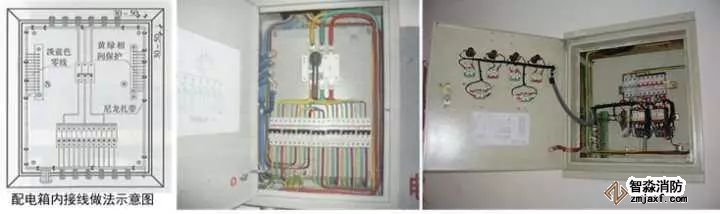 4、箱(柜)內接線:先將線(纜)理順,按照100~200mm的間距用尼龍扎帶進行綁扎,拐角兩側30~50mm及分支處應設扎帶,按照黃色(L1)、綠色(L2)、紅色(L3)、淡藍色(N)、黃綠相間色(PE)分別接入A相、B相、C相、N線、PE線端子上,多股線應壓接線端子;標識:應在N、PE端子排附近刻寫或粘貼“N"、“PE”標識,進入配電盤的外部回路應扎回路牌,進入配電盤的控制線在導線套上號碼管;接地:配電箱(柜)的接地螺栓、箱門上的接地螺栓、電源進線回路的PE線、配電箱饋出各個回路的PE線、與配電箱連接金屬導管均應PE端子直接連接,導通良好。