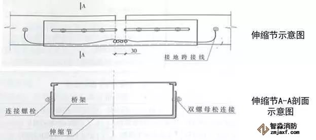 4、伸縮節安裝:當橋架經過建筑伸縮縫或橋架直線長度大于30m(鋁合金及其他材料直線段長度大于15m)時,應設置伸縮節,伸縮節應設置在伸縮縫位置或直線長度的中間。伸縮節兩側各設置一個支架,支架與伸縮節端部距離不大于500mm。伸縮節補償收縮襯板應設在伸縮節外側,襯板螺栓孔應開成條形孔,襯板長度為兩個連接板長度之和加30mm,雙螺母應位于橋架外側,且不能擰緊,以保證自由伸縮。伸縮節兩端橋架應采用軟銅線做接地跨接,接地線中間應留有余量。