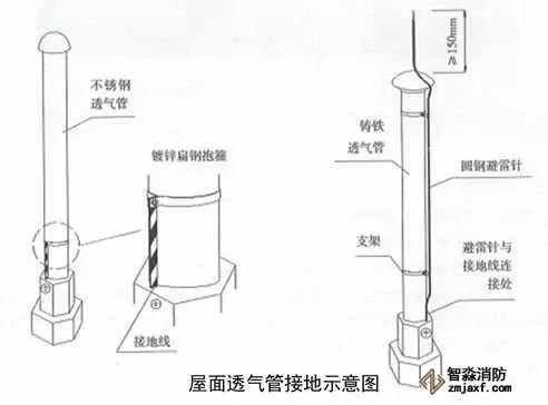 5、屋面金屬通氣管接地:采用鍍鋅扁鋼自屋面避雷網從透氣管根部引出,用抱箍沿透氣管固定,距根部或裝飾臺面間距300mm,根部與接地線連接,搭接長度不小于100mm,透氣管的連接部位做接地跨接。