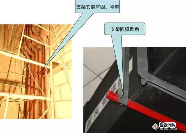 質量控制要點:支架安裝牢固,成排支架應排列成線、標高一致。