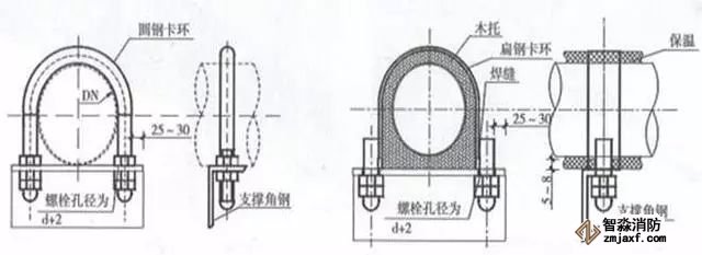 選擇與管徑匹配的卡環,卡環安裝固定螺栓孔應保證管道順直且居卡環中間,卡環與管道應接觸緊密。圓鋼卡環與不銹鋼管、銅管連接固定時,卡環應套塑料保護軟管,管道與支架間接觸面應墊與角鋼同寬的隔離橡膠墊。扁鋼卡環應與木托同寬,與螺栓應滿焊連接;在與支架連接處應垂直,扁鋼端部與支架宜留有5~8mm收縮余量,卡環端部外露支架的螺栓宜采用圓頭螺帽收頭,油漆涂刷應均勻。
