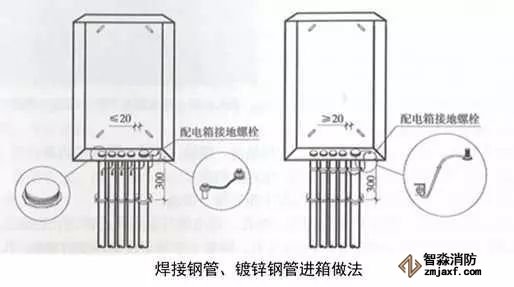 2、明配管進箱處理:對于明配導管,距配電箱300處進行固定;箱體采用開孔器開孔,孔徑與管徑相一致,開孔間距均勻,邊沿間距不小于20mm;進入箱體的導管端部套絲,采用鎖母固定,外露2~3扣絲;箱體與導管之間、箱體與裝設電氣部件的門之間采用編織軟銅線進行接地連接,編織軟銅線兩端壓接接線端子。