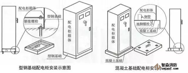 1、配電柜安裝:參照配電柜的寬厚尺寸,制作10號槽鋼基礎,按設計位置安裝,在型鋼基礎的下面四角適當的位置鉆孔,在地面相應位置用膨脹螺栓固定基礎型鋼,調整水平度;將配電柜與型鋼基礎對正,然后用螺栓固定,成排配電柜兩兩之間側面用螺栓連接;按系統圖或接線圖要求將電纜、電線與相應的電器端子連接;將電源的接地線(PE線)、各回路的接地線(PE線)、金屬導管的接地線接在配電柜的接地端子上。配電室房門應加設防水防火擋鼠板,高度不低于0.7m。