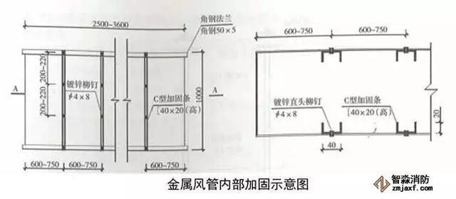 大口徑(b≥2500mm)鍍鋅鋼板風管加固:利用1.2mm厚的鍍鋅鋼板制作C形條,沿風管寬度方向將C形條按600~750mm間距鉚接。鉚釘按200~220mm間距鉚接在風管內側。加固完成后安裝風管兩側法蘭。