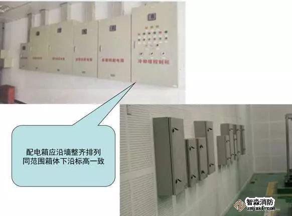 2)配電箱應沿墻整齊排列,同范圍箱體下沿標高一致。箱體高度600mm以內,底邊距地1.5m;箱體高度600~800mm,底邊距地1.2m;箱體高度800~1000mm,底邊距地1.0m;箱體高度1000~1200mm,底邊距地0.8m;箱體高度1200mm以上落地安裝;預空間滿足安全距離及檢修空間要求;