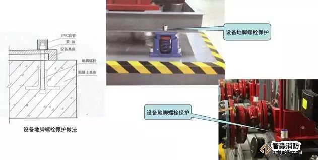 2、設備地腳螺栓防水防腐保護:對室外和多水房間安裝的設備地腳螺栓,根據設備地腳螺母大小及螺栓外露長度確定套管的直徑及高度,成排或同一區域內螺栓外露長度應一致,以確保套管高度一致且覆蓋螺栓頂面5mm。套管直徑與螺母直徑匹配,套管安裝后用黃油填塞套管與螺栓之間的間隙,上口與套管平齊。