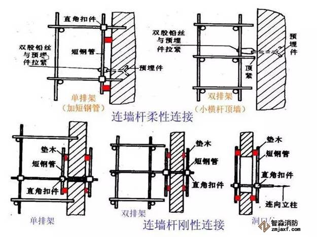 1、利用穿墻螺栓孔,使用三角形支架作底座搭設鋼管腳手架,高度一般為3個樓層高9個人認為不安全因素較多,不提倡,但成本低)。