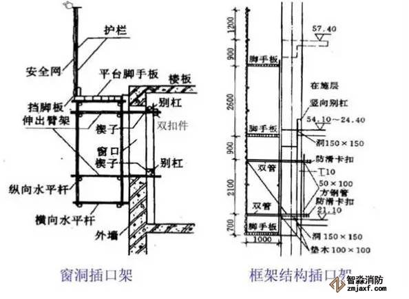 其他用鋼管線條懸挑,在多層建筑可以使用,但注意對固定位置要控制好,鋼管的傾斜角度,拉結都必須控制,不安全因素也比較多,最好還是用使用。