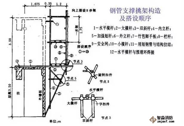 2、利用型鋼擱置在樓層內作為底座(樓面擱置長度大于1.5米,樓層內預埋2道圓鋼錨固型鋼)搭設鋼管腳手架,同時用剛纜斜拉,高度不超過24米或8層。(個人認為也有浪費嫌疑,完全可以通過計算定下型鋼和圓鋼規格,不考慮斜拉。不過安全系數高,可以考慮)