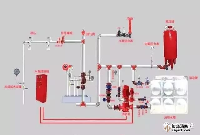 (1)消防給水基礎(chǔ)設(shè)施:包括消防水池、消防水泵、消防水箱、增壓穩(wěn)壓設(shè)備等。該設(shè)施的主要任務(wù)是為系統(tǒng)儲存并提供滅火用水。