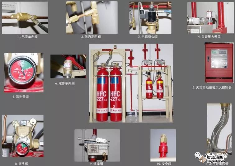 滅火系統(tǒng)主要由氣流單向閥、低通高阻閥、電磁瓶頭閥、自鎖壓力開關(guān)、溶濟量表、液體單向閥、氣體報警滅火控制器、瓶頭閥、選擇閥、安全閥、高壓金屬軟管等設(shè)備組成。