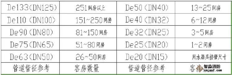 4.冷水管材質(zhì)采用PPR給水管。【 100間房計(jì)算】主水管的管徑在 De90左右以上,干管的管徑:De50-75,支管的管徑:De25-50 。客房衛(wèi)生間給水管徑要求:不小于PPR-De20的管徑。