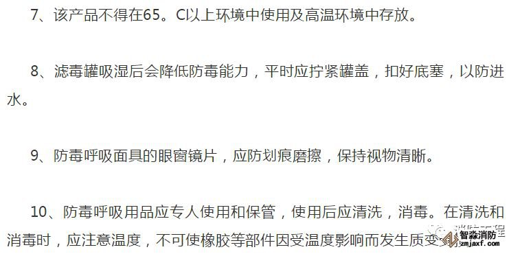 6、應嚴格遵守濾毒罐的有效時間。在使用過程必須記錄濾毒罐使用過的時間、毒物性質、濃度等。若記錄卡片上累計使用時間達到濾毒罐規定的時間,應立即停止使用。在使用過程中嚴禁隨意擰開濾毒罐(盒)的蓋子,并防止水或其它液體進入罐(盒)中。