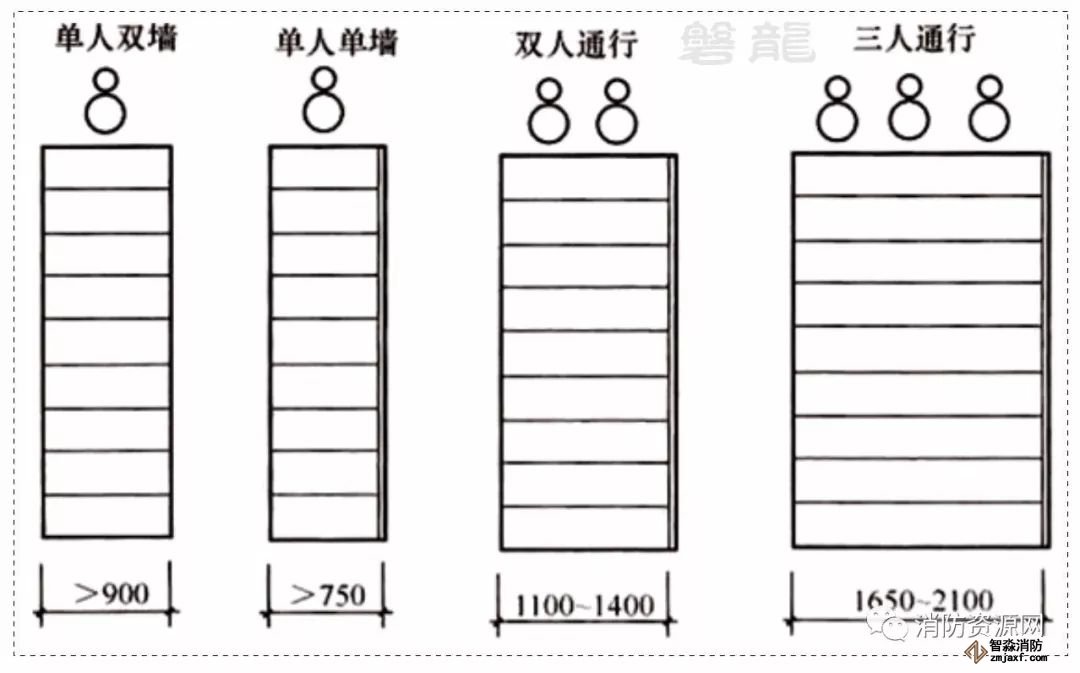 注:樓梯梯段凈寬在防火標(biāo)準(zhǔn)中是以每股人流為0.55m計(jì),并規(guī)定按兩股人流最小寬度不應(yīng)小于1.10m,這對(duì)疏散樓梯是適用的,而對(duì)住宅套內(nèi)樓梯、維修專用樓梯外的其他平時(shí)用作日常主要交通的樓梯不完全適用,尤其是人員密集的公共建筑(如商場、劇場、體育館等)主要樓梯應(yīng)考慮多股人流通行,使垂直交通不造成擁擠和阻塞現(xiàn)象。此外,人流寬度按0.55m計(jì)算是最小值,實(shí)際上人體在行進(jìn)中有一定擺幅和相互間空隙,因此本條規(guī)定每股人流寬度為0.55m+(0~0.15)m,(0~0.15)m即為人流眾多時(shí)的附加值,單人行走樓梯梯段寬度還需要適當(dāng)加大,見下圖。