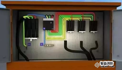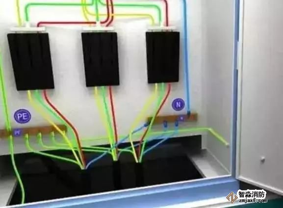 1、從總配電箱的分配電開關分別引出黃、綠、紅(A、B、C)三相線,淡藍色工作零線從工作零接線端引出,黃綠雙色PE保護零線從PE端子引出。