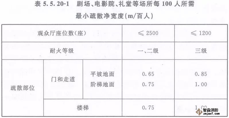 2、劇場、電影院、禮堂等場所供觀眾疏散的所有內門、外門、樓梯和走道的各自總凈寬度,應根據疏散人數按每100人的最小疏散凈寬度不小于表5.5.20-1的規定計算確定;