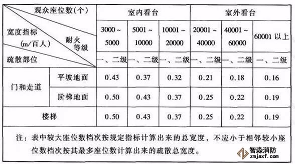 注:本表中對應較大座位數范圍按規定計算的疏散總凈寬度,不應小于對應相鄰較小座位數范圍按其最多座位數計算的疏散總凈寬度。對于觀眾廳座位數少于3000個的體育館,計算供觀眾疏散的所有內門、外門、樓梯和走道的各自總凈寬度時,每100人的最小疏散凈寬度不應小于表5.5.20-1的規定。