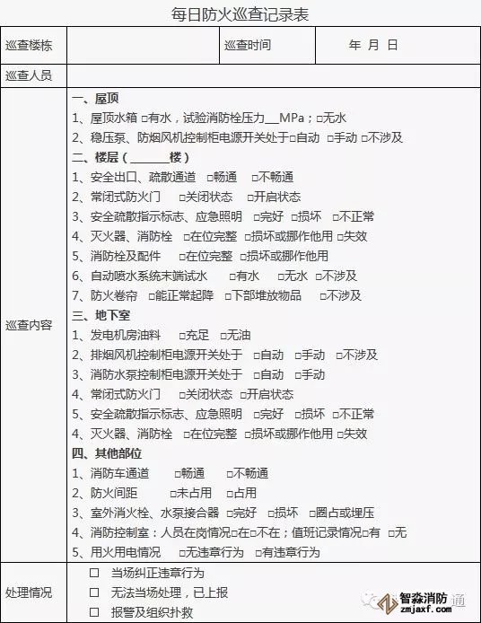 3、情況正常在“檢查結果”欄中標注“正常”;發現的問題或存在故障應在“存在問題或故障處理情況”欄中填寫,并及時處置;當場不能處置的要填報《建筑消防設施故障處理記錄》;其他需要說明的情況在“檢查說明”欄填寫。