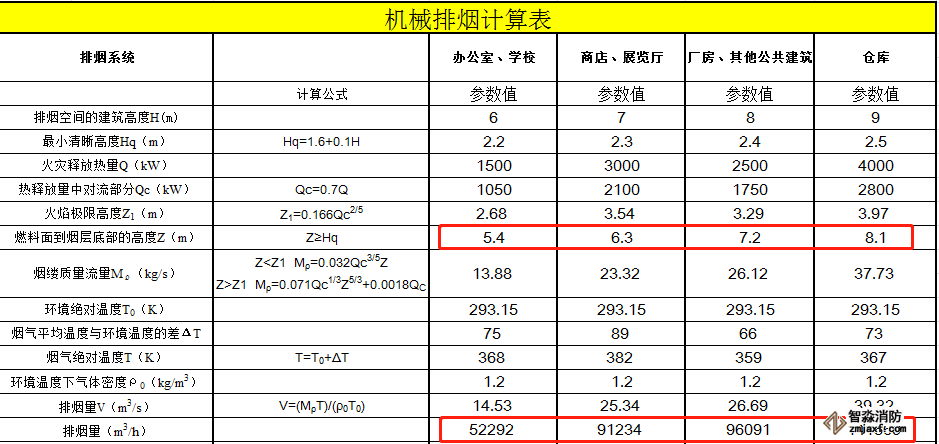 通過反算可知,表4.6.3中的排煙量數(shù)據(jù),應(yīng)該是按儲煙倉高度為10%房間凈高時的結(jié)果(以下為有噴淋情況的反算推算表),儲煙倉高度為房間凈高的10%,是規(guī)范要求的機(jī)械排煙最小儲煙倉厚度,也是燃料面到煙層底部高度(Z)的最大高度,由下表公式可知,相同條件下,煙層底部高度(Z)最大值時對應(yīng)的排煙量即最大排煙量,也就是說,表4.6.3所列的排煙量為最大排煙量,任何其他計算條件下的排煙量都不可能大于這個排煙量,再規(guī)定計算值不應(yīng)小于表4.6.3中的數(shù)值無意義。