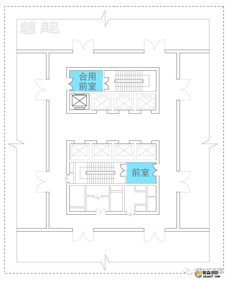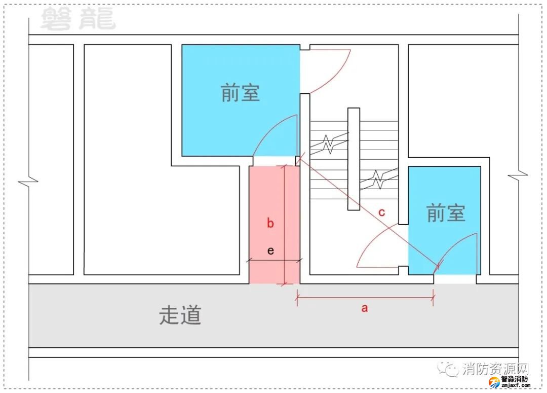 二、“前室穿套”的情況,屬于雙向借用,違反“疏散門應向疏散方向開啟”的強條要求:目前的防火門均為“單一方向旋轉”,并不存在雙向開啟的防火門。