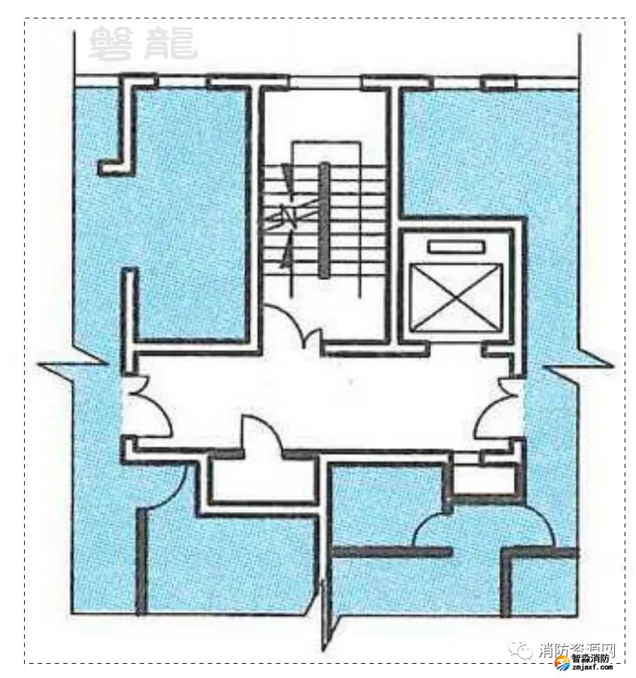 示例33中,前室設置有突出的消火栓箱,前室有效面積和凈寬度均應扣除突出障礙物部分,如圖所示的藍色部分為有效面積和有效寬度: