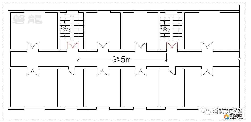 1、正確示例(示例6):本示例的戶門對走道開啟,疏散走道有兩個安全出口,具備雙向疏散功能。