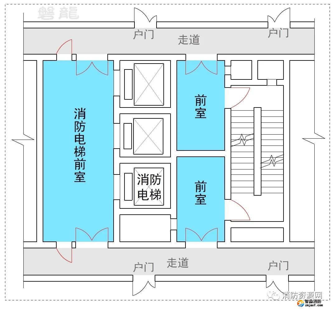 前室應該是相對規則的區域,特殊情況下,可以有不規則的擴展部分,但應確保消防電梯前室規則區域的尺寸及面積要求,有疏散功能的通道,其凈寬度應計算確定,并不應小于對應建筑內疏散走道的最小凈寬度要求。