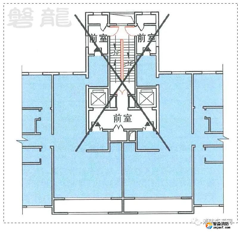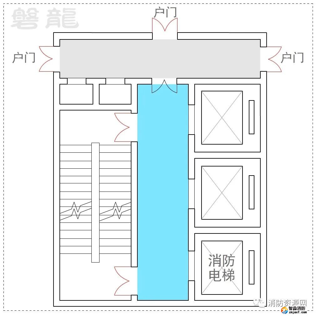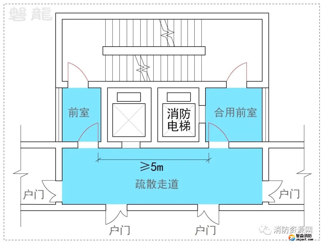 人員可以通過消防電梯前室疏散(比如合用前室的情況),以此為據,穿越獨立的消防電梯前室,在住宅建筑中通常被許可,但公共建筑應予禁止: