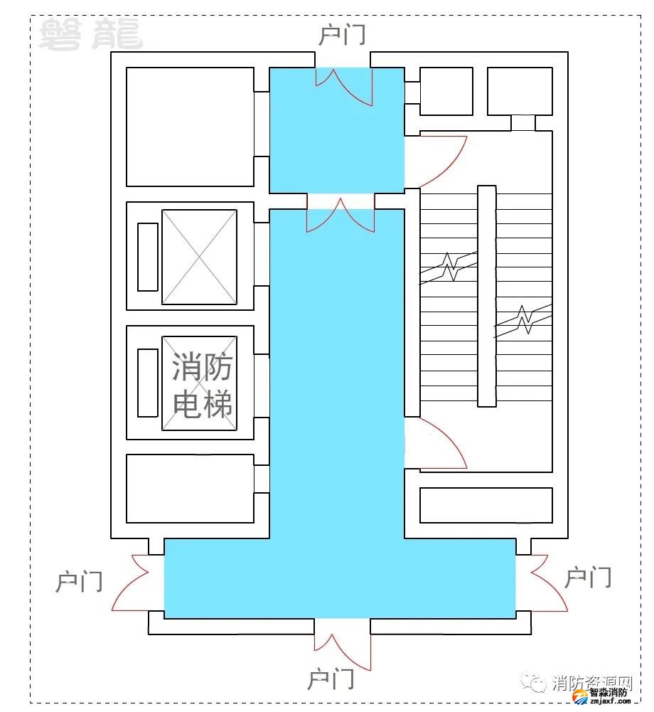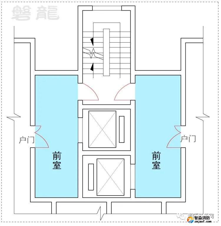 2、許可示例(示例27):本示例中,戶門直接對消防電梯前室開放,也通常認為可行:(有爭議)