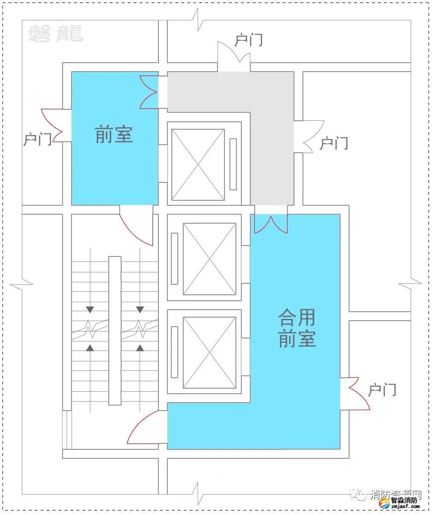 前室是防煙樓梯間的基本要素,安全疏散應遵行“走道(或戶門)→前室→樓梯間”的基本規則。進入前室,就已抵達安全出口,應從疏散樓梯撤離,不能再進入了另一個前室,更不能通過走道(不安全區域)進入了另一個前室。