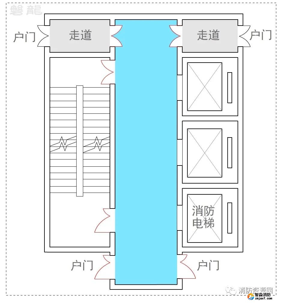 判斷原則:為防止極端方案的出現,我們可以通過取消過道門的方式判斷,如取消過道門后滿足開向同一前室的戶門不大于3樘的要求,那么我們可以認為過道是一種加強性安全措施,否則不應許可!