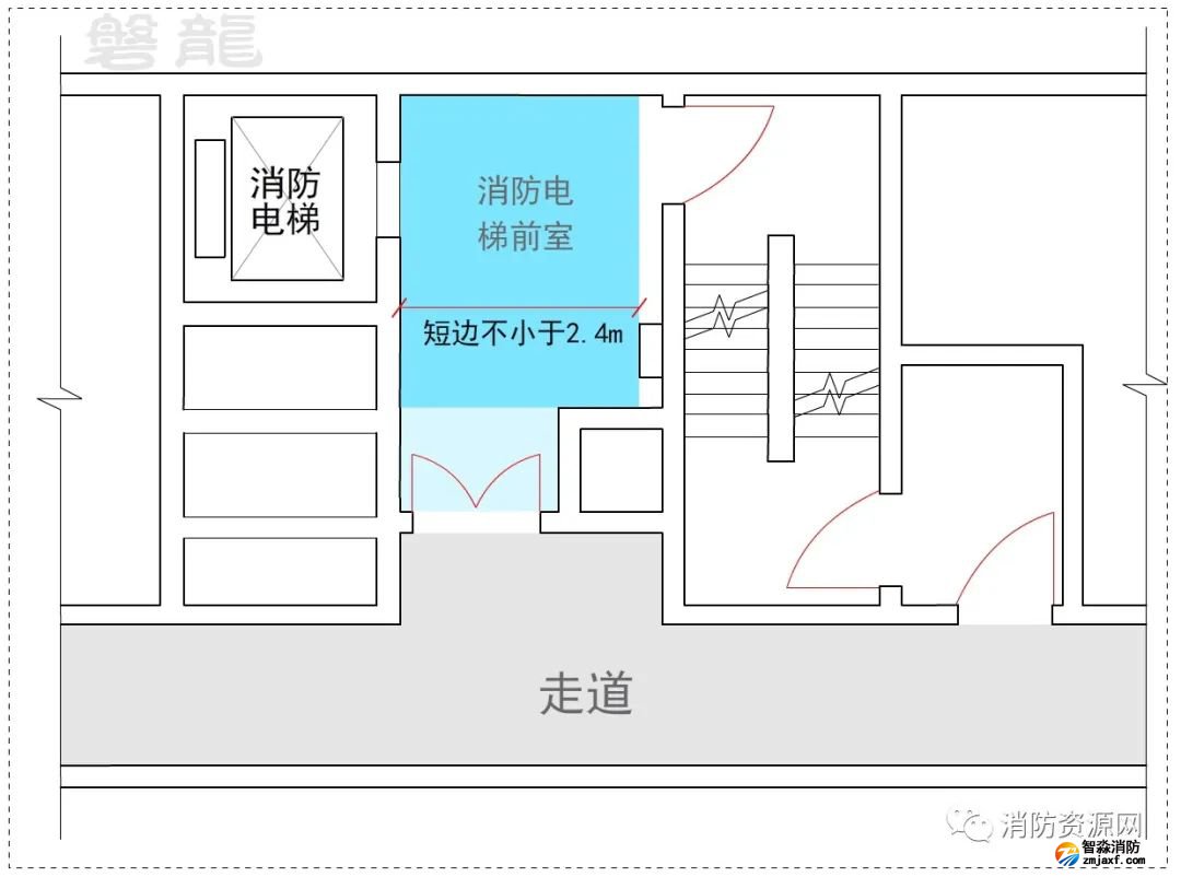 消防電梯前室的短邊不應小于2.4m,主要是為了滿足消防員整裝和擔架運輸等功能要求,前室的面積和尺寸應是與消防電梯門正對的規則區域,不應通過過道、拐角等擴展區域來實現。