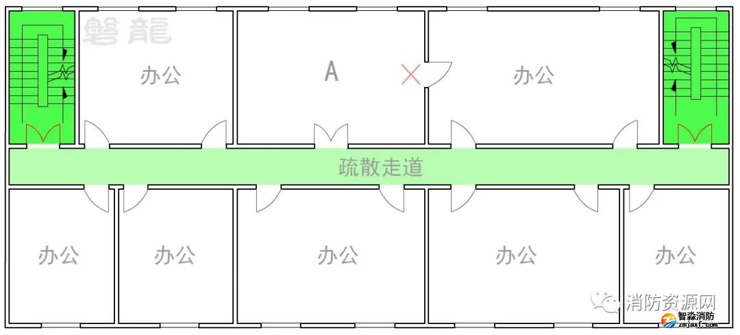 圖示5的辦公室A需要兩個疏散門,疏散門應直接通向疏散走道,不應通過其他房間疏散。