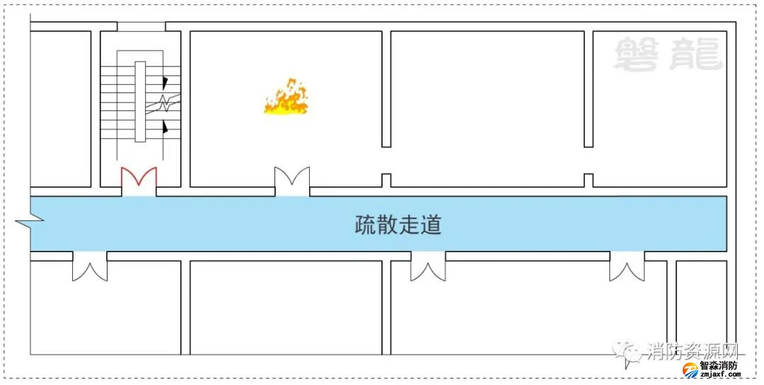 1、室內房間屬于危險區域,一旦發生火災,人員應迅速疏散至相對安全的次危險區域(疏散走道),通過疏散走道疏散至安全出口(圖示1)。