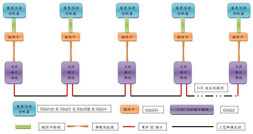 2) 串聯接線方式只須增加本公司GM663光纖接口模塊與聯網卡GK6024,每臺控制器配接2個。