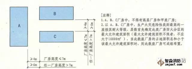 除高層廠房和甲類廠房外,其他類別的數座廠房占地面積之和小于本規范第3.3.1條規定的防火分區最大允許建筑面積(按其中較小者確定,但防火分區的最大允許建筑面積不限者,不應大于10000㎡)時,可成組布置。當廠房建筑高度不大于7m時,組內廠房之間的防火間距不應小于4m;當廠房建筑高度大于7m時,組內廠房之間的防火間距不應小于6m。