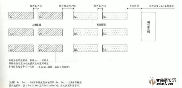 除高層民用建筑外,數座一、二級耐火等級的住宅建筑或辦公建筑,當建筑物的占地面積總和不大于2500㎡時,可成組布置,但組內建筑物之間的間距不宜小于4m。組與組或組與相鄰建筑物的防火間距不應小于本規范第5.2.2條的規定。